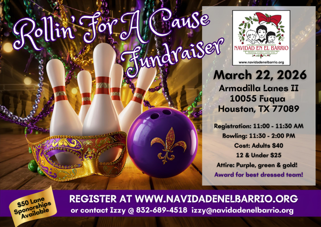 By attending Bowling for a Cause, you help support Navidad En El Barrioโs year-round programs that bring joy, hope, and opportunity to those who need it most. Your participation helps fund community events, holiday programs, and outreach efforts that have made a difference since 1987.